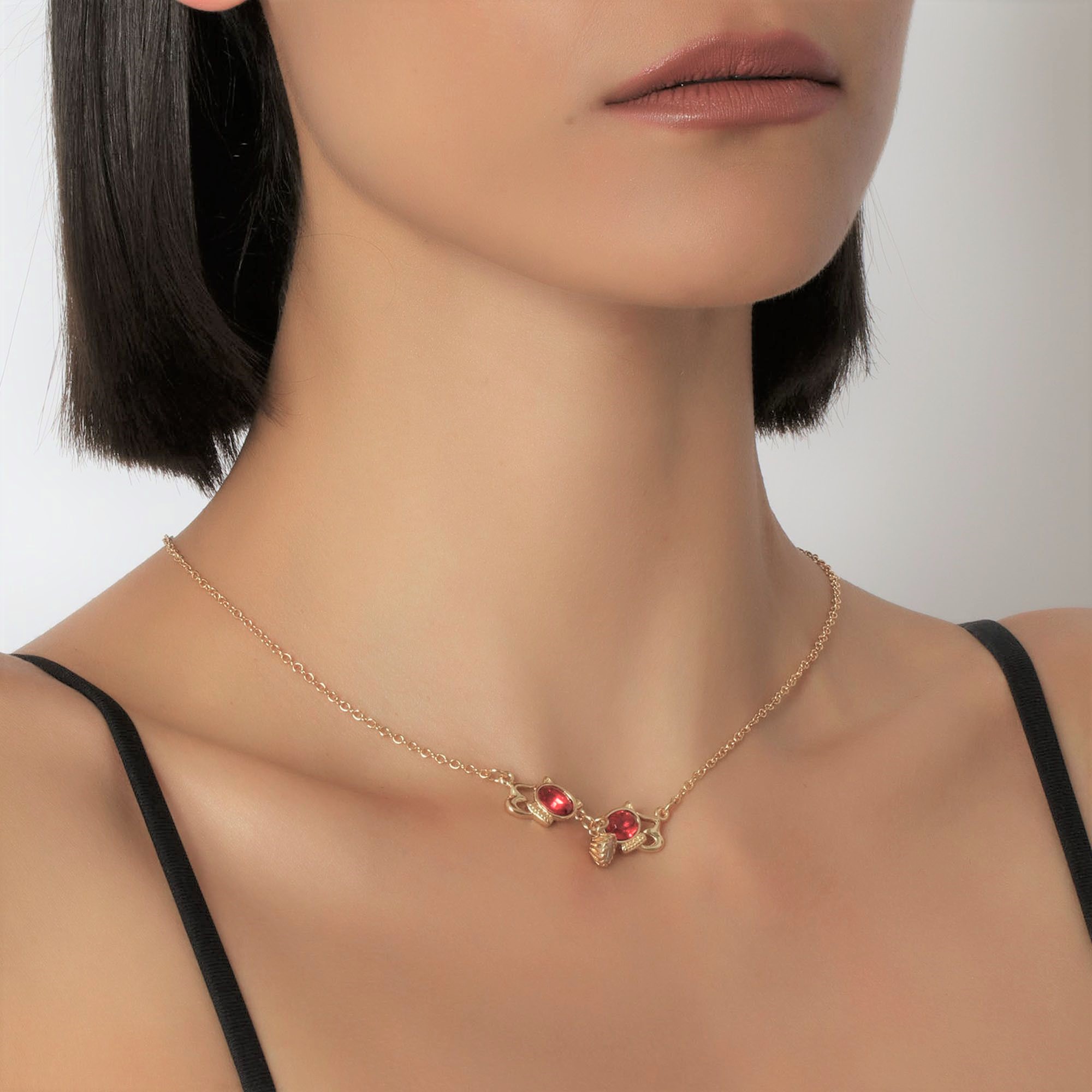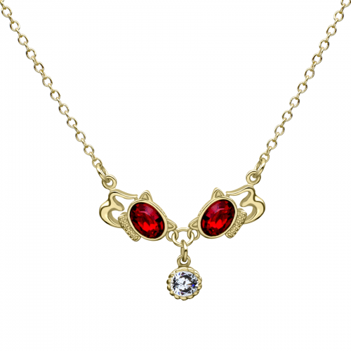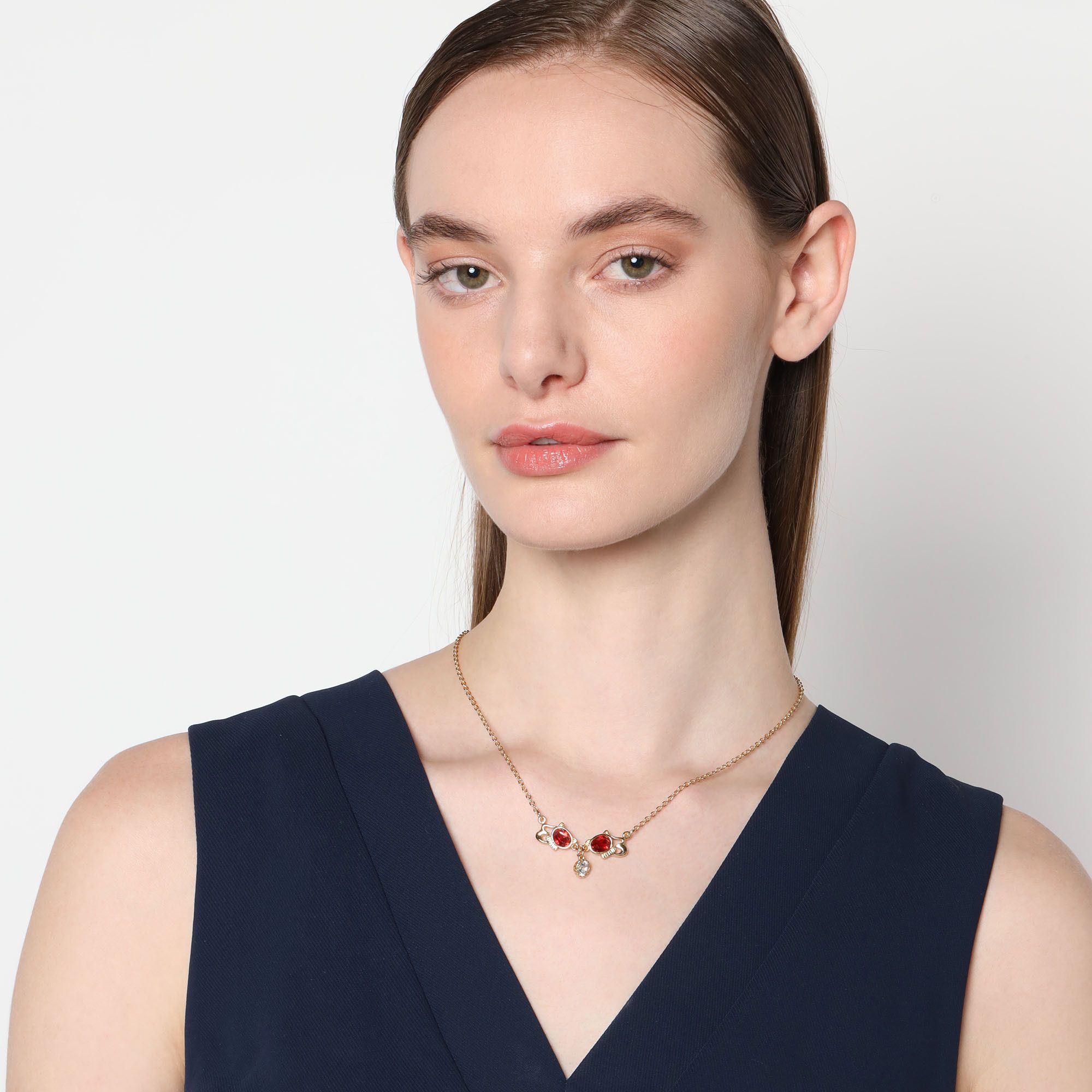 Exquisito Collar en baño de oro amarillo de 18 quilates, fino diseño con incrustación de cristales en color blanco y color carmín. Fabricado en una estructura de aleación de platino con rodio sin níquel 1. joyería Hipoalergénica. 2. Incluye cajita de joyería. 3. Garantía de 30 días por defectos de fabrica.