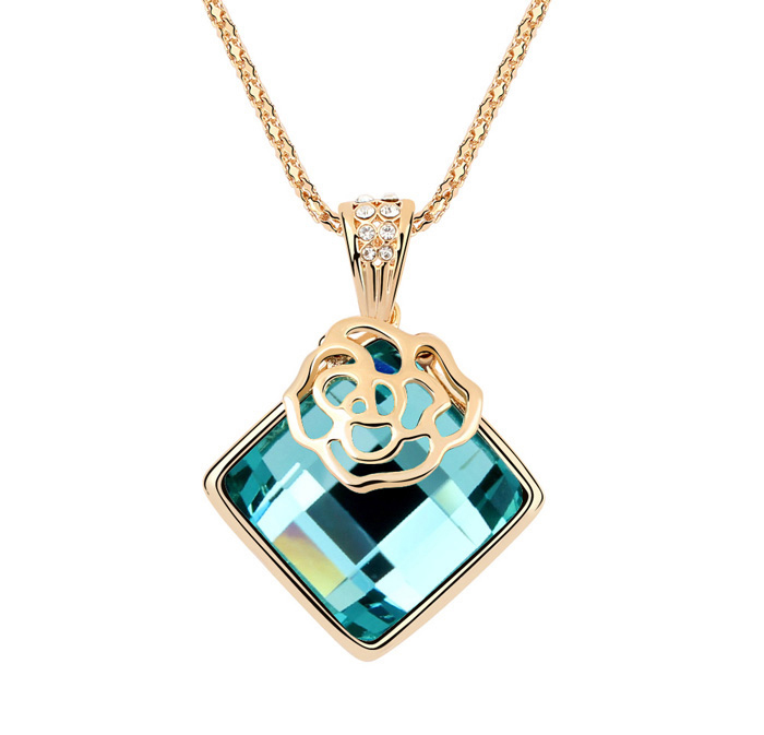 Elegante Dije en baño de oro amarillo de 18 quilates, con grabado de rosa y cristal en color aqua. Cuenta con una cadena de 40 cm, con extención de 5 cm. Fabricado en una estructura de aleación de platino con rodio sin níquel. 1. joyería Hipoalergénica. 2. Incluye cajita de joyería. 3. Garantía de 30 días por defectos de fabrica.