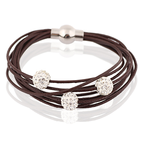 Pulsera con detalles en baño de oro blanco de 18 quilates, correas de vinipiel en color café, original diseño, con beads plateados, incrustaciones de cristales blancos y broche magnético.