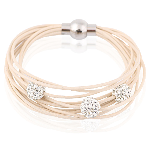 Pulsera con detalles en baño de oro blanco de 18 quilates, correas de vinipiel color beige, original diseño, con beads plateados, incrustaciones de cristales blancos y broche magnético.