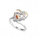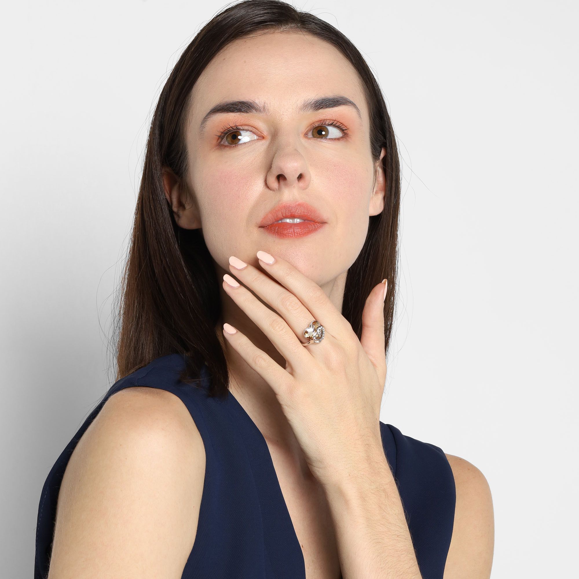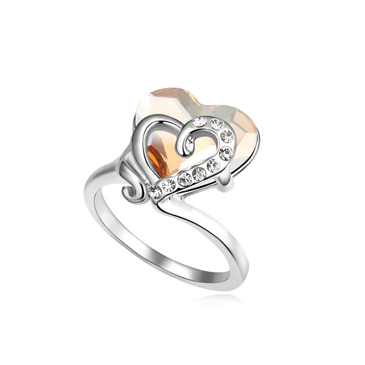 Hermoso anillo, en baño de oro blanco de 18 quilates, diseño de corazón, con cristal ámbar corte corazón e incrustaciones de cristales blancos.