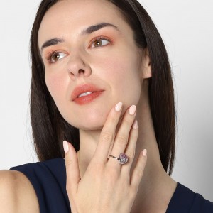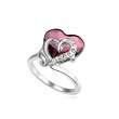 Hermoso anillo, en baño de oro blanco de 18 quilates, diseño de corazón, con cristal color ciruela, corte corazón e incrustaciones de cristales blancos.