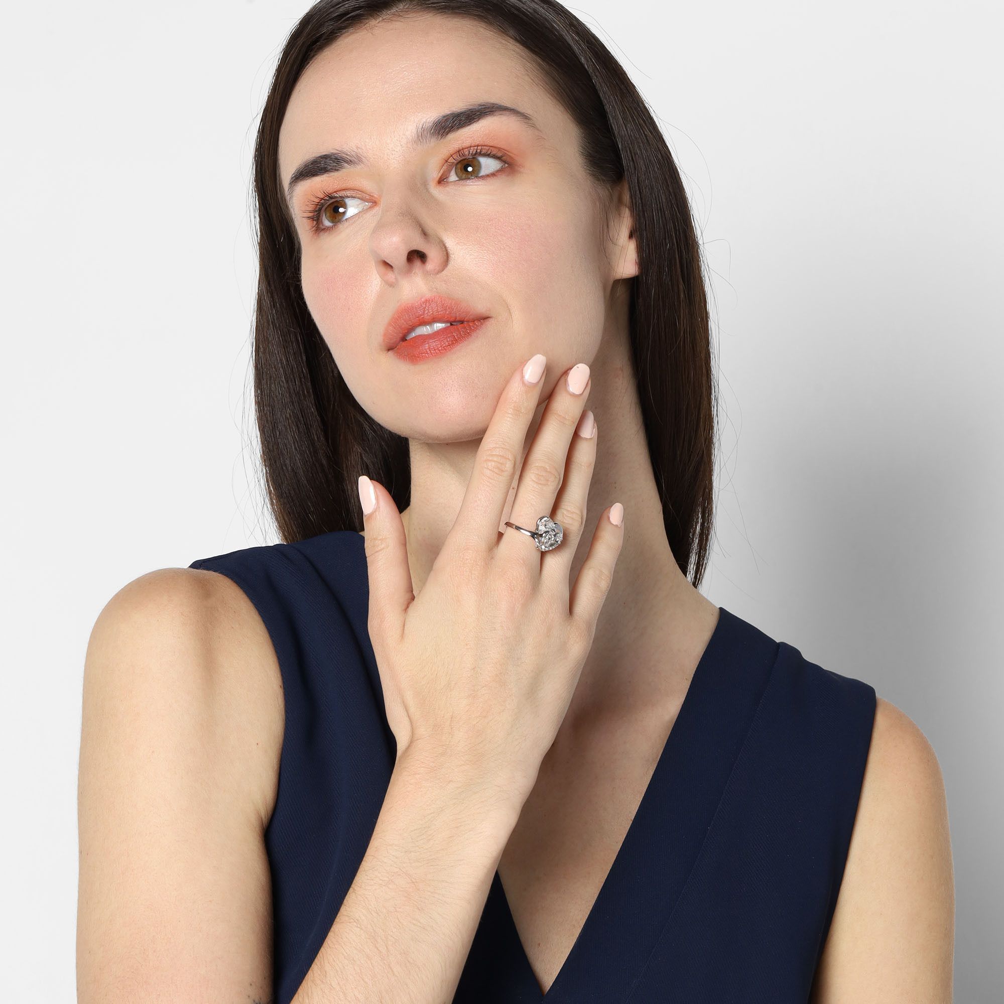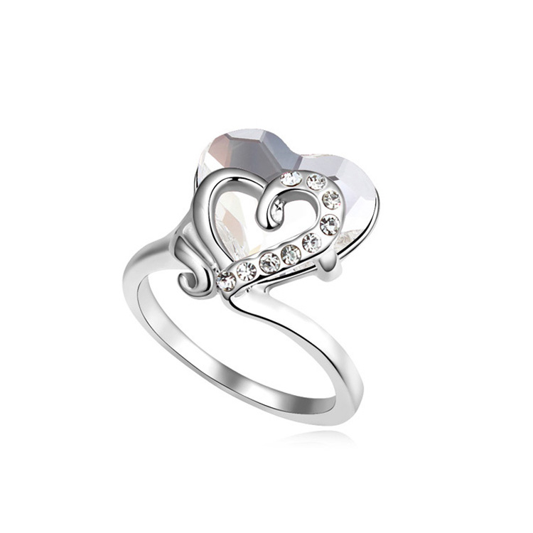 Hermoso anillo, en baño de oro blanco de 18 quilates, diseño de corazón, con cristal blanco corte corazón e incrustaciones de cristales blancos.