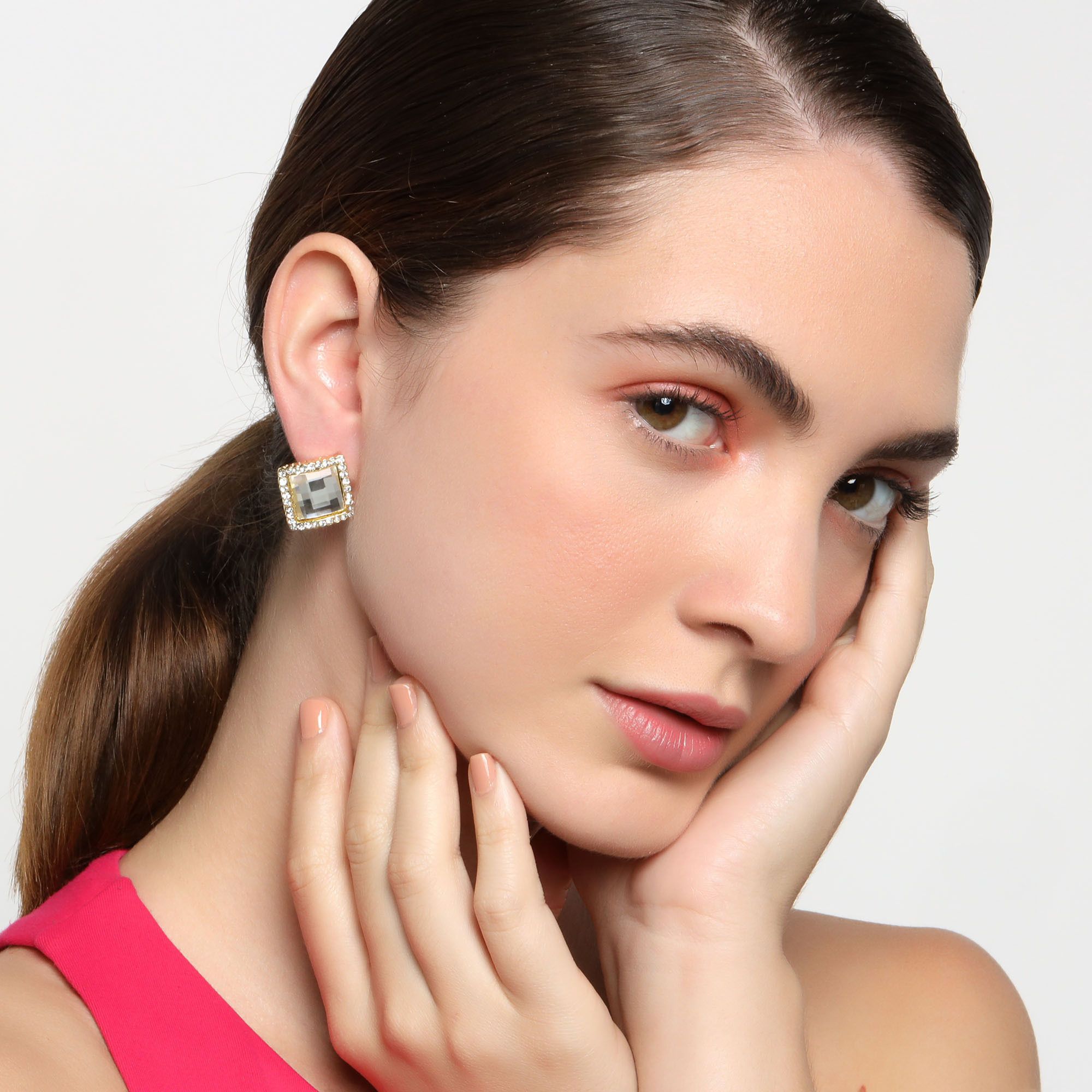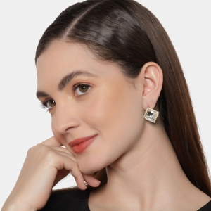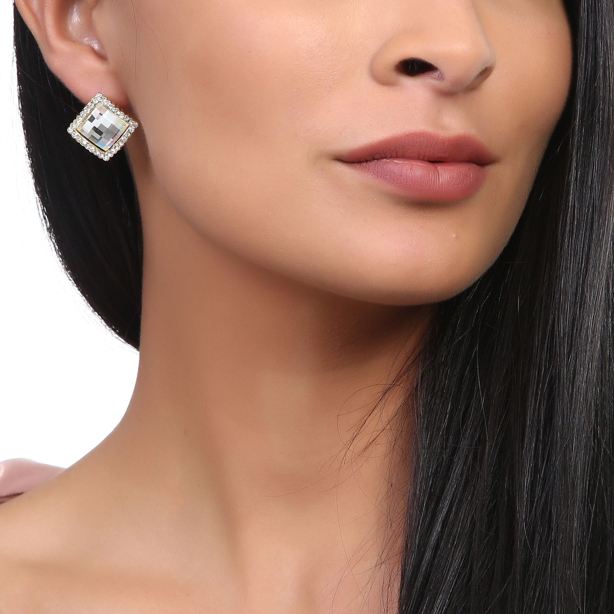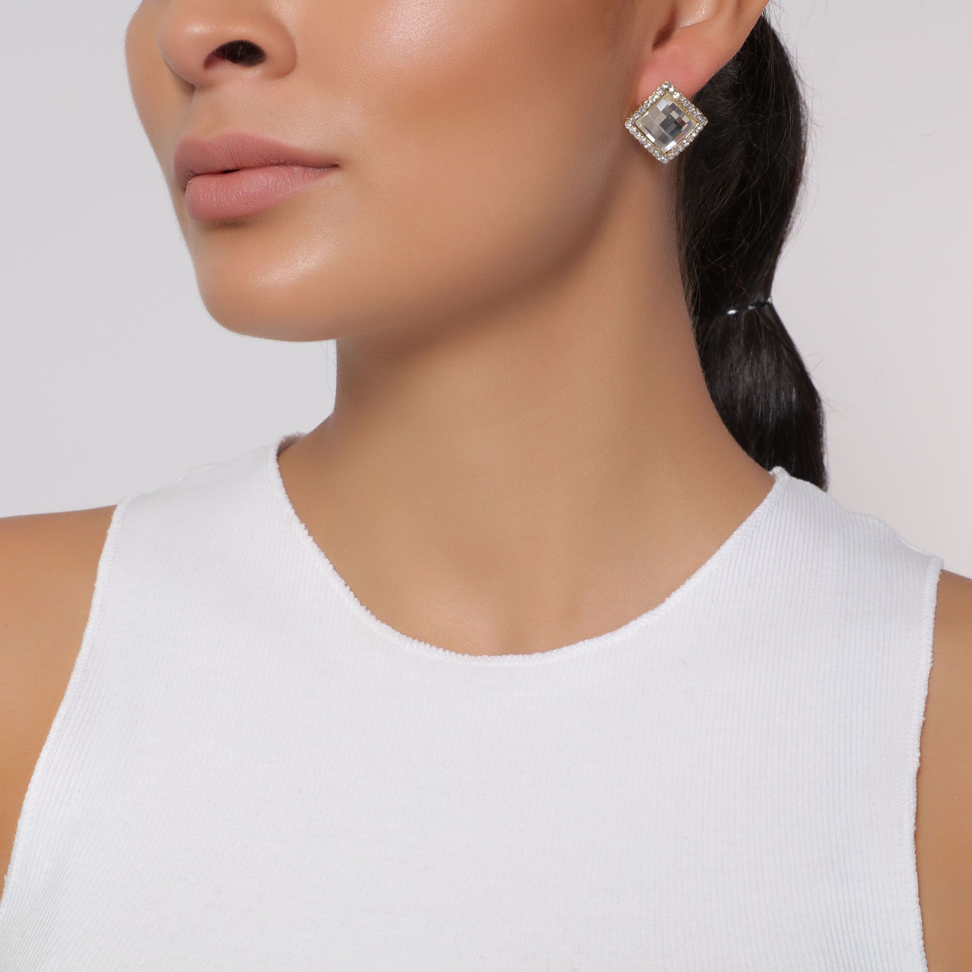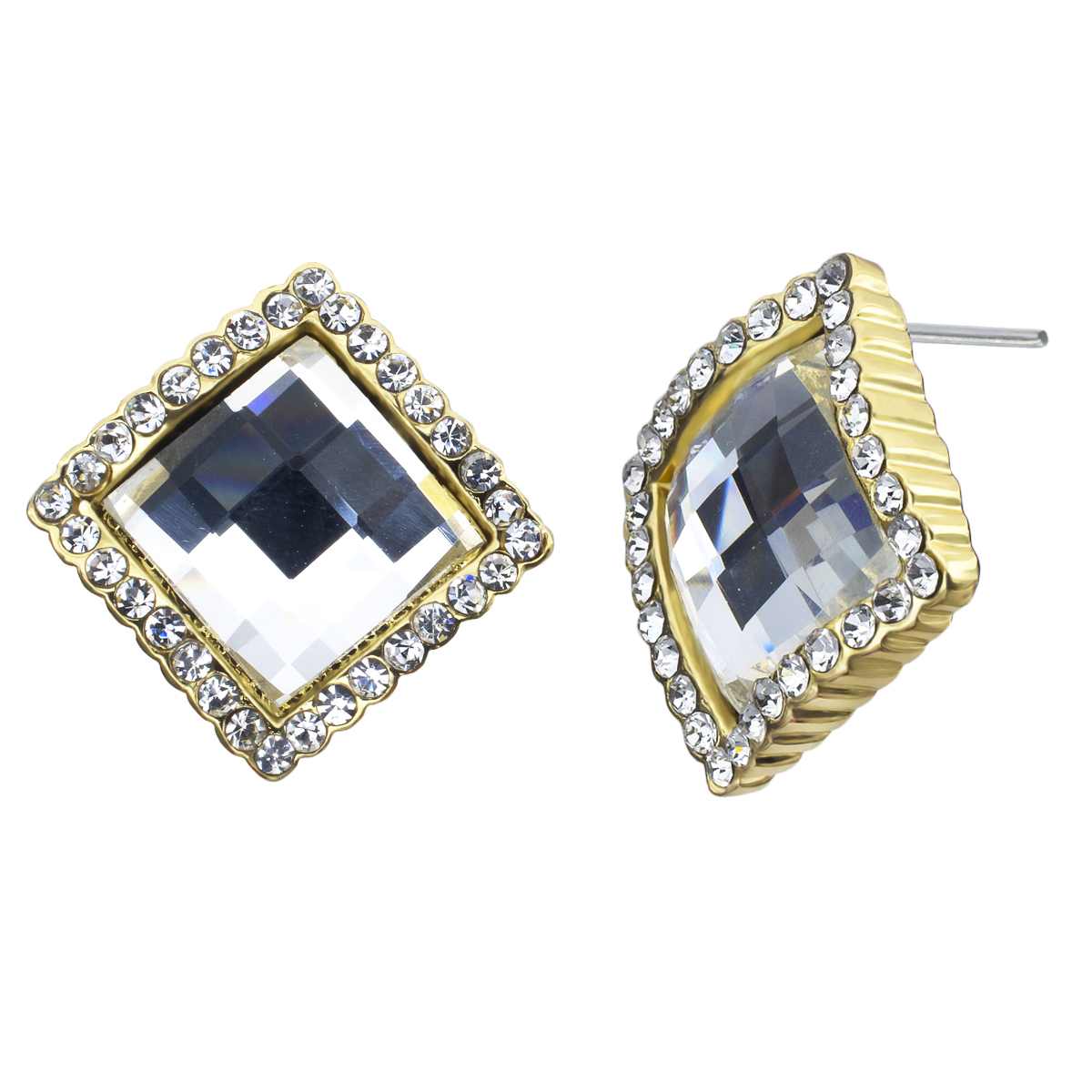 Elegantes aretes, en baño de oro amarillo de 18 quilates, diseño de rombo, con cristal blanco facetado corte cushion e incrustaciones de cristales blancos en el contorno. Fabricado en una estructura de aleación de platino con rodio sin níquel.