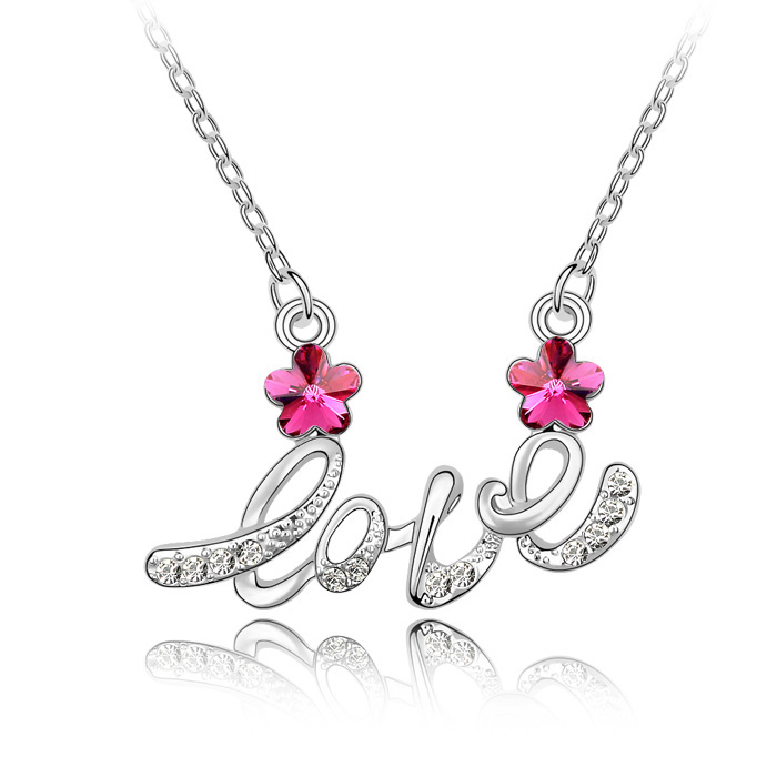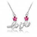 Precioso Collar en baño de oro blanco de 18 quilates, con palabra Love y detalles de cristales en color blanco y rosa.