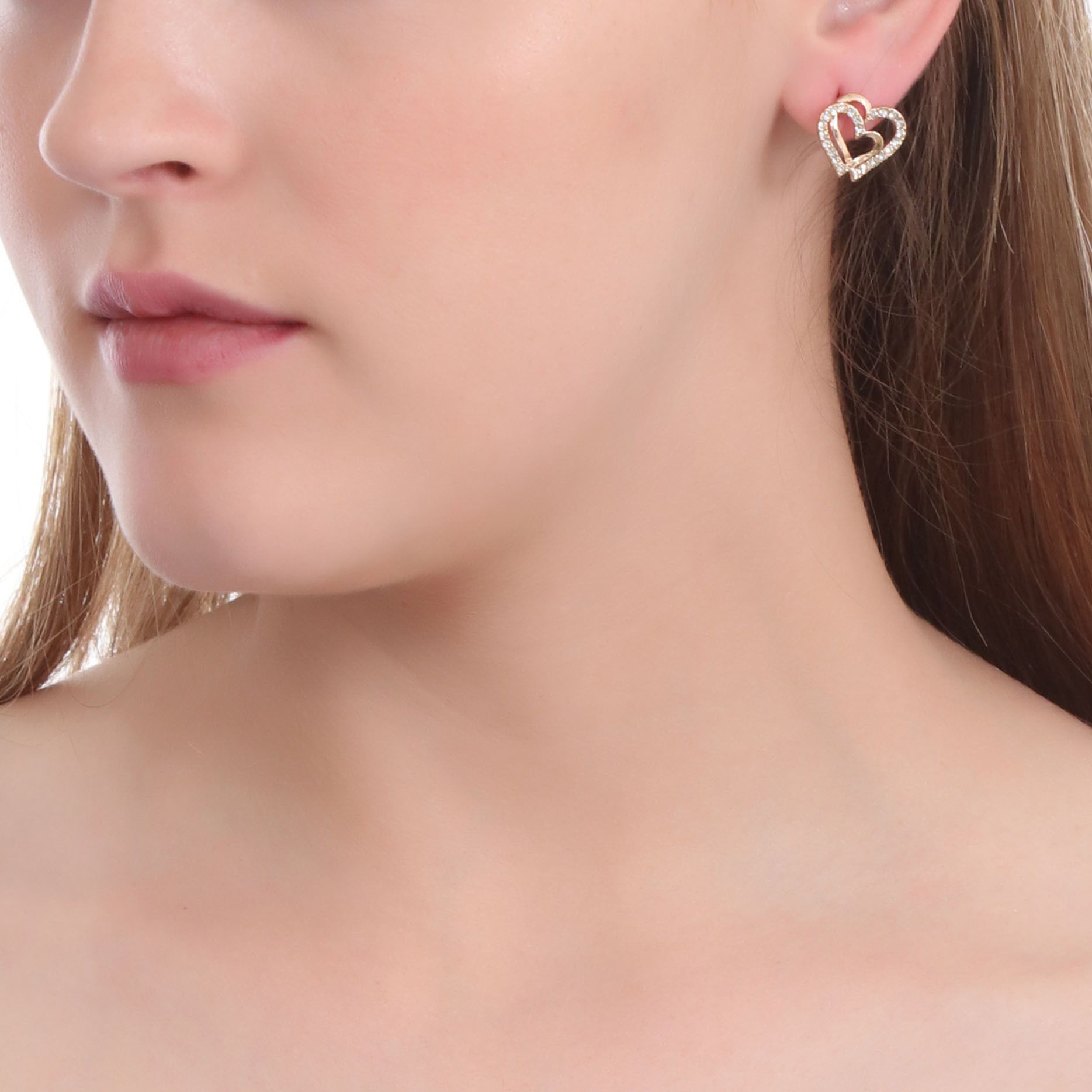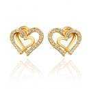 Tiernos aretes, en baño de oro amarillo de 18 quilates, diseño de corazones entrelazados, con incrustación de cristales en color blanco.