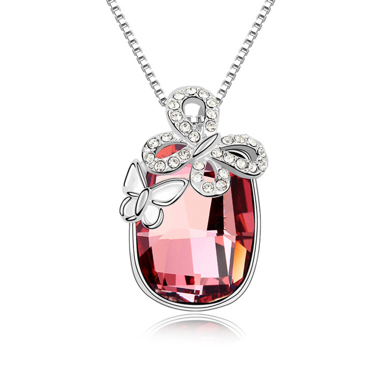 Precioso dije en baño de oro blanco de 18 quilates, con cristal color púrpura corte cushion, mariposas e incrustación de cristales blancos.