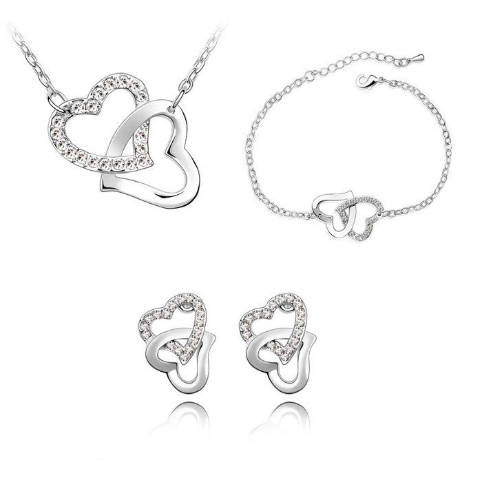 Juego de retes, pulsera y dije en baño de oro blanco de 18 quilates, diseño de corazónes entrelazados con incrustación de cristales en color blanco. cadena de 40 cm, con extención de 5 cm.