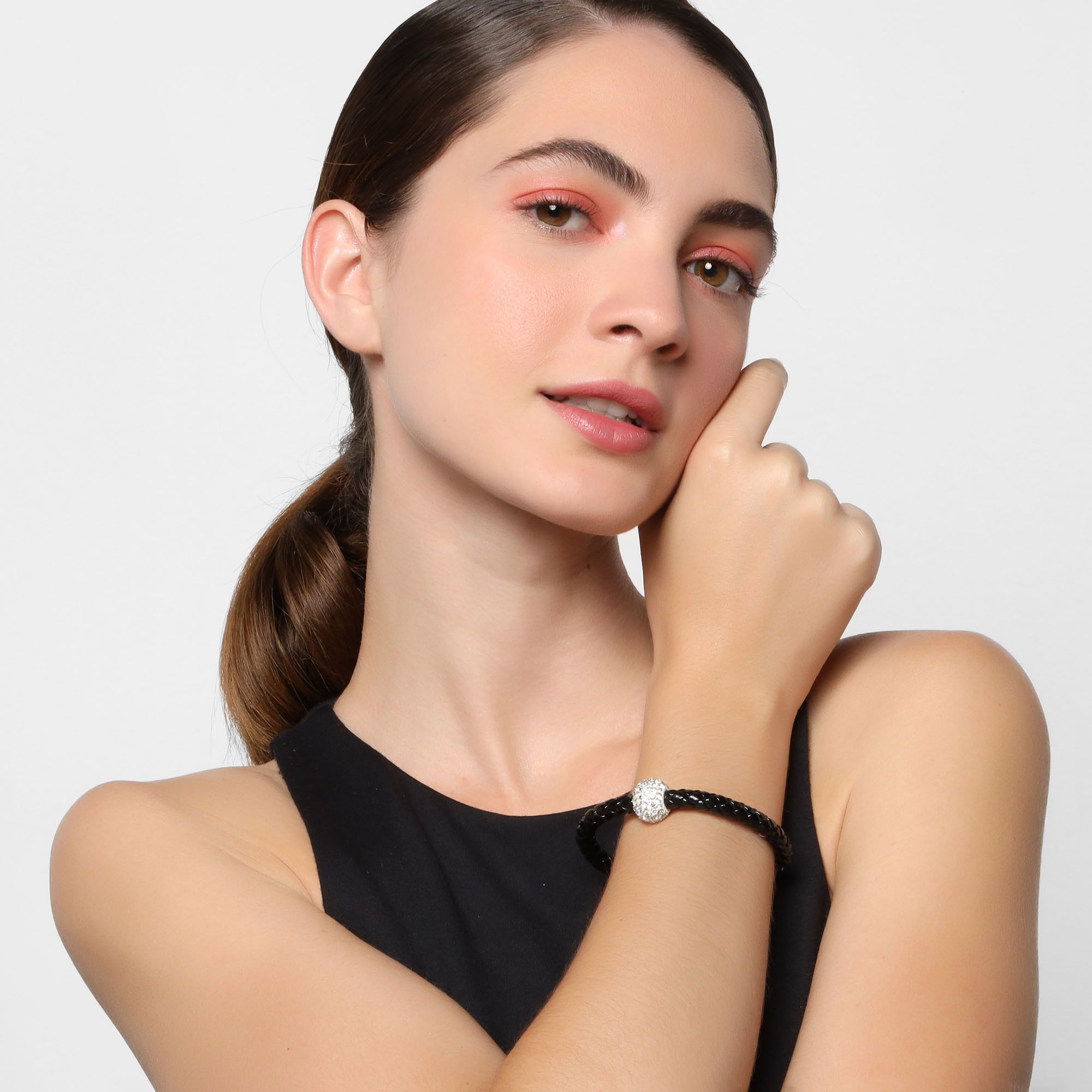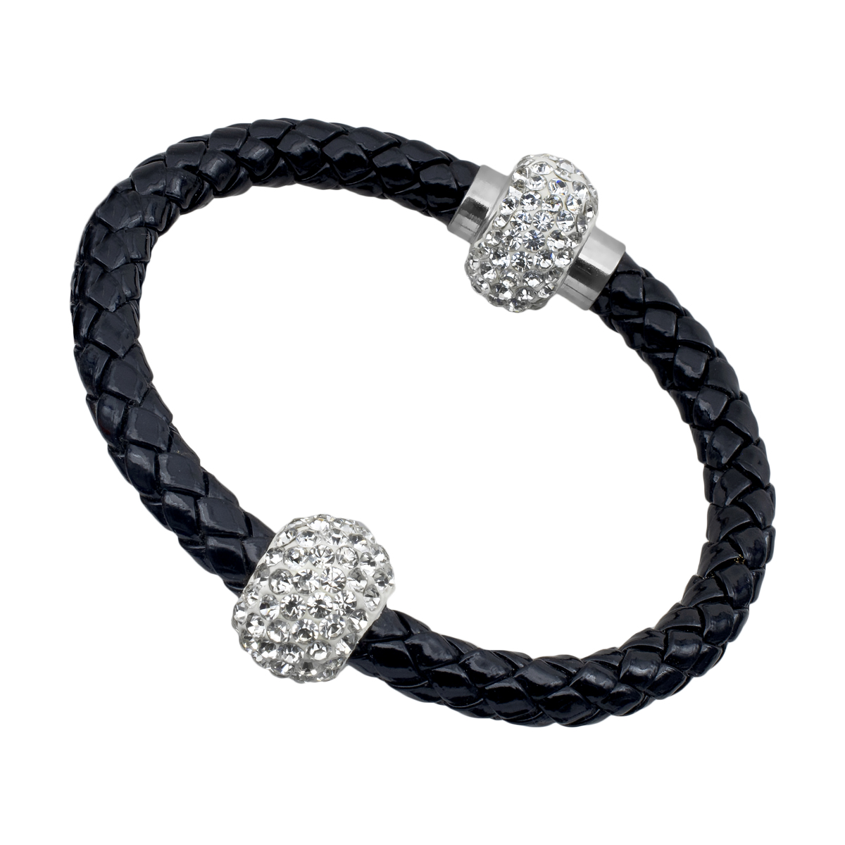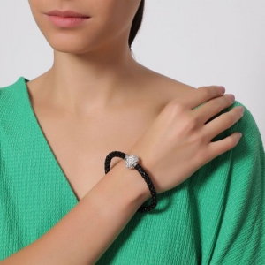 Pulsera con detalles en oro blanco de 18 quilates, correa de vinipiel trenzada color negro, beads plateados con incrustaciones de cristales blancos y broche magnético.
