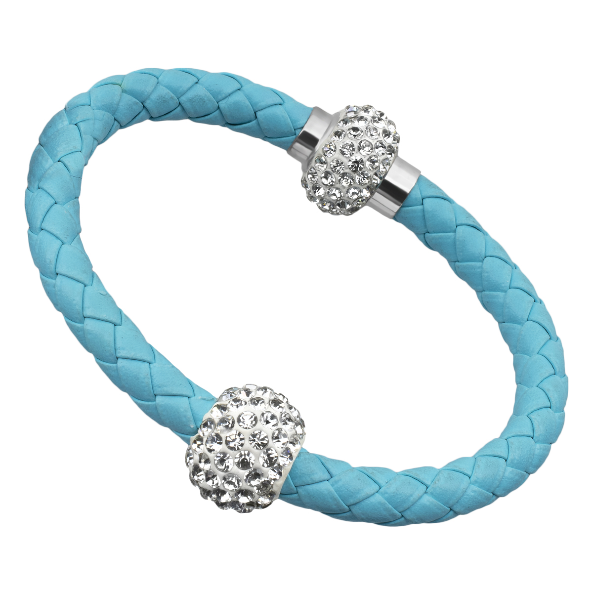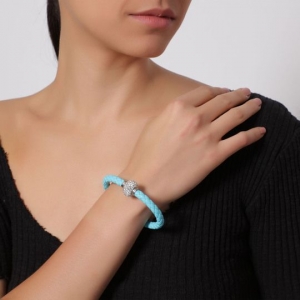 Pulsera con detalles en oro blanco de 18 quilates, correa de vinipiel trenzada color azul, beads plateados con incrustaciones de cristales blancos y broche magnético.