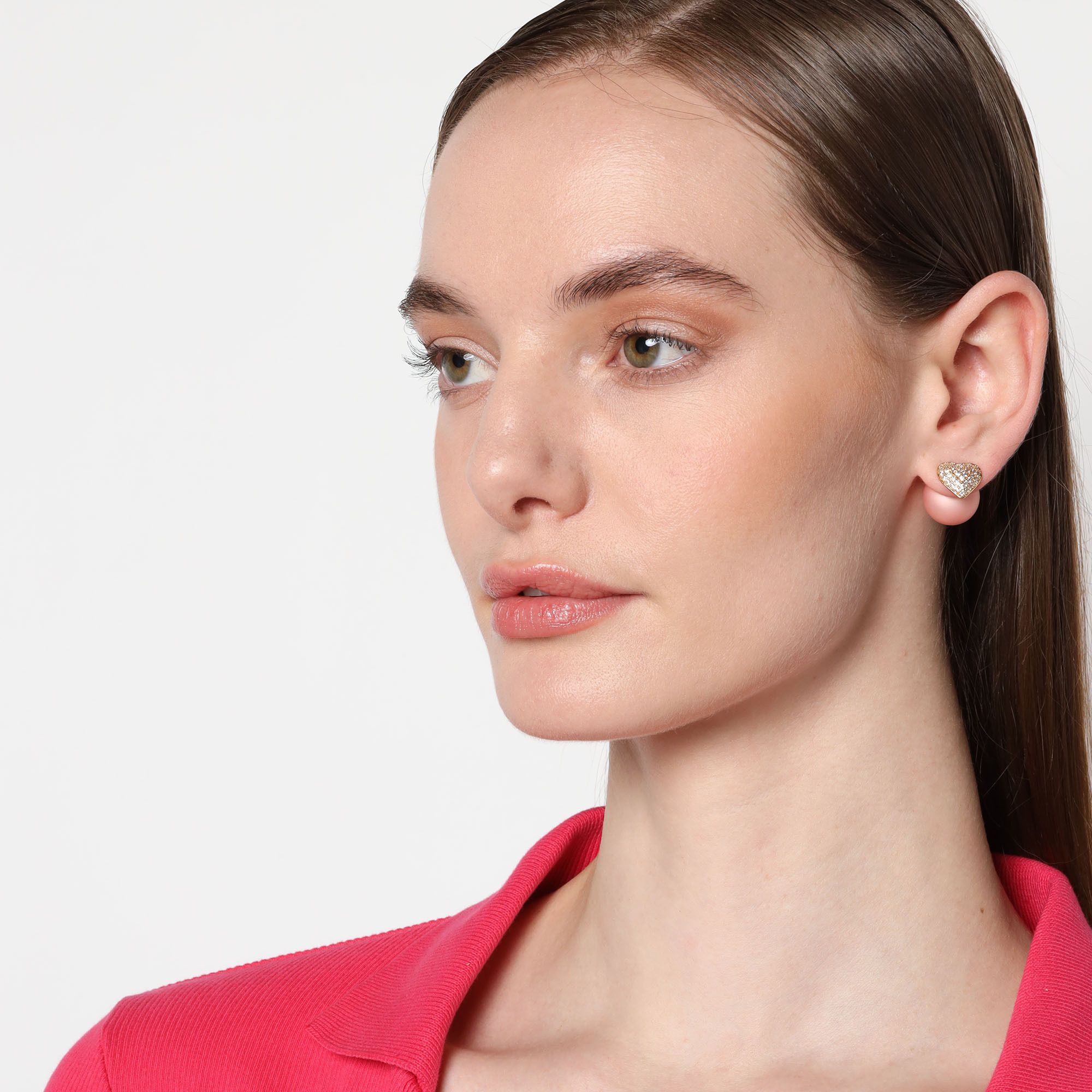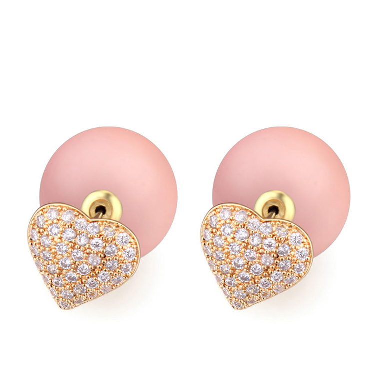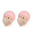 Lindos aretes, en baño de oro amarillo de 18 quilates, diseño de corazón, con perla rosa e incrustación de cristales en color blanco. Fabricado en una estructura de aleación de platino con rodio sin níquel.