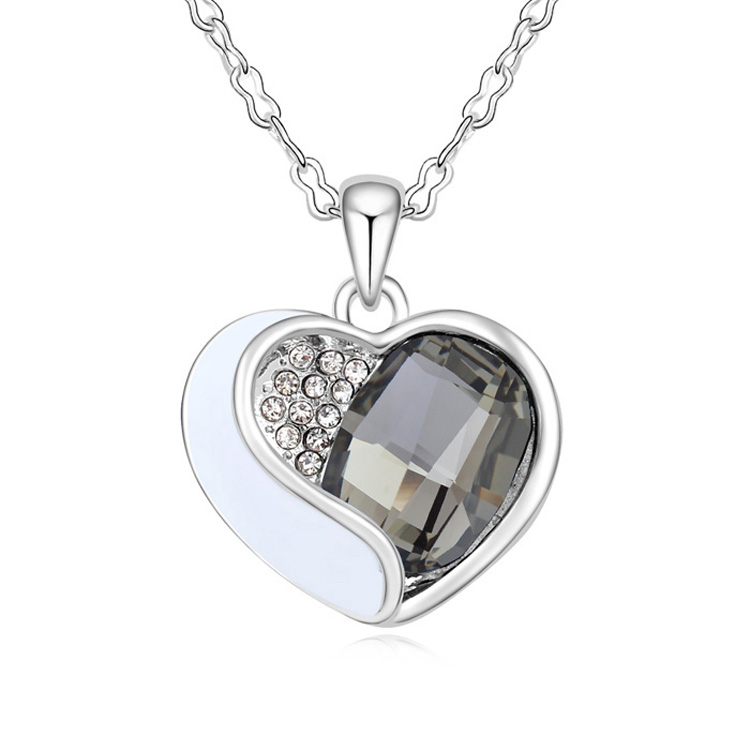 Dije en baño de oro blanco de 18 quilates, diseño de corazón con incrustación de cristales en color blanco y humo. Cuenta con una cadena de 40 cm, con extención de 5 cm.