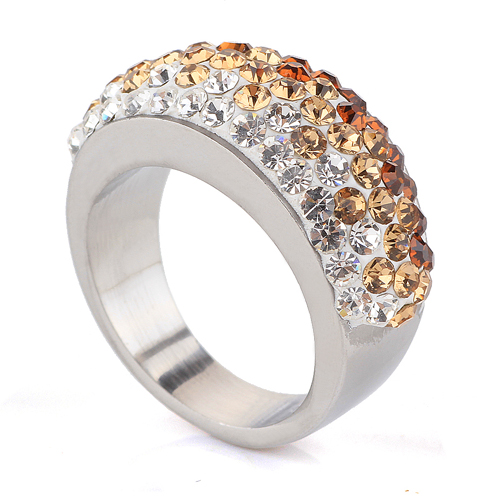 Precioso anillo, en baño de oro blanco de 18 quilates, exquisito diseño, estilo degradado, con incrustaciones de cristales en color blanco, ámbar y tabaco.