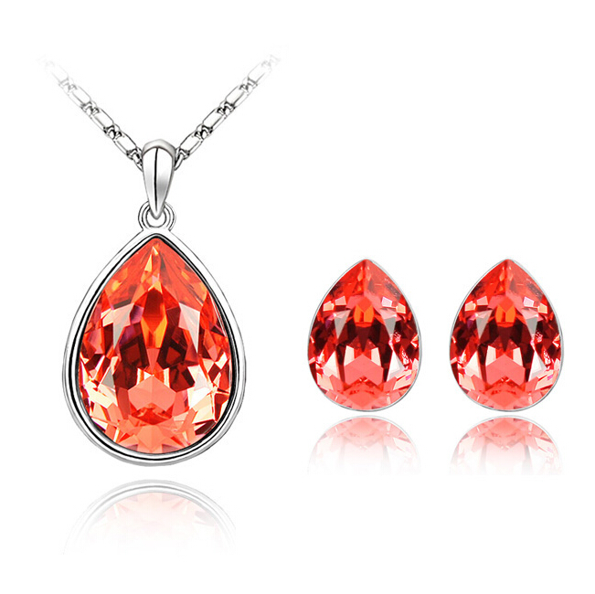 Juego de aretes y dije en baño de oro blanco de 18 quilates, diseño de gota con incrustación de cristales en color naranja.