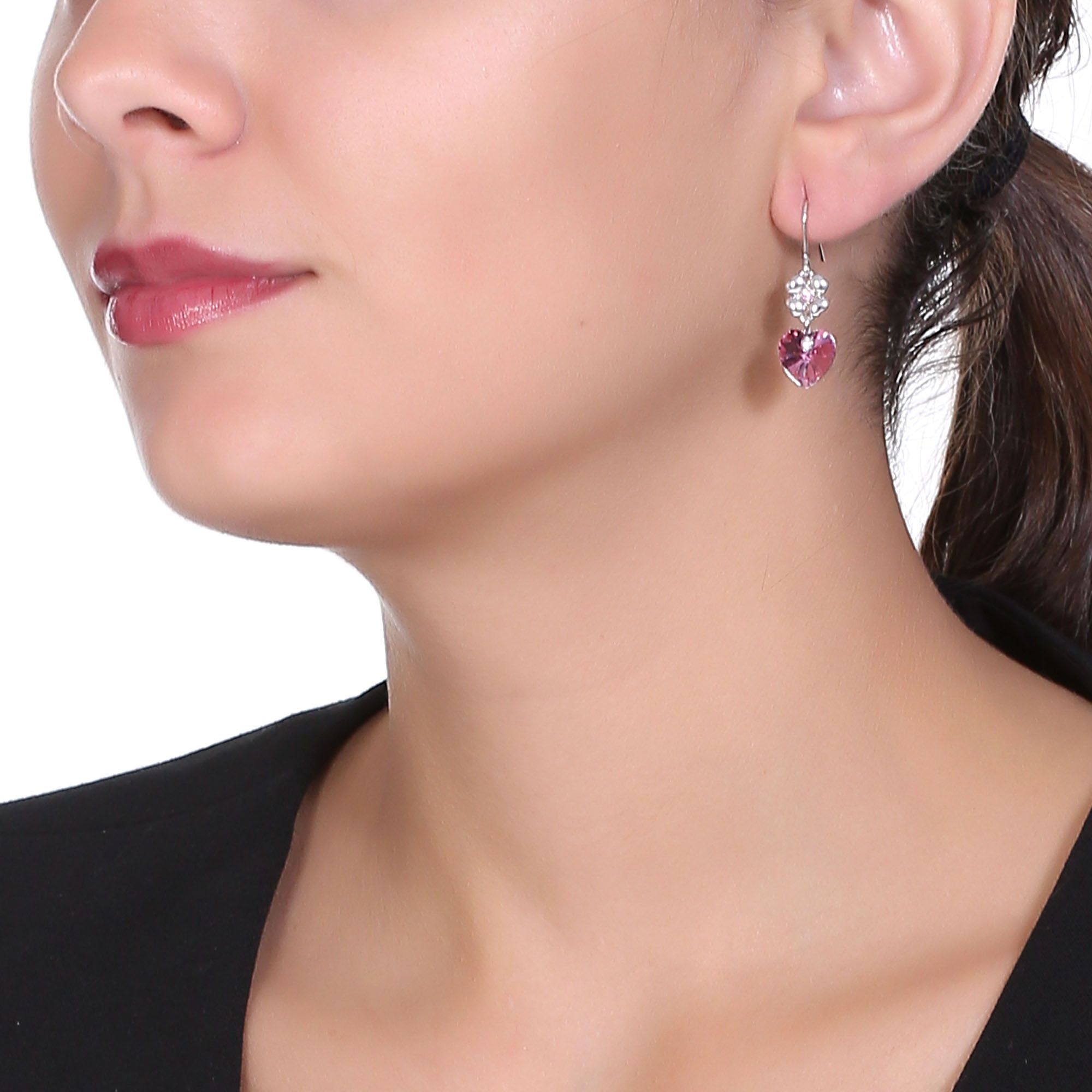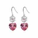 Preciosos aretes, en baño de oro blanco de 18 quilates, diseño de corazón en cristal rosa, pequeña flor plateada e incrustación de cristales rosa y blanco. Fabricado en una estructura de aleación de platino con rodio sin níquel.