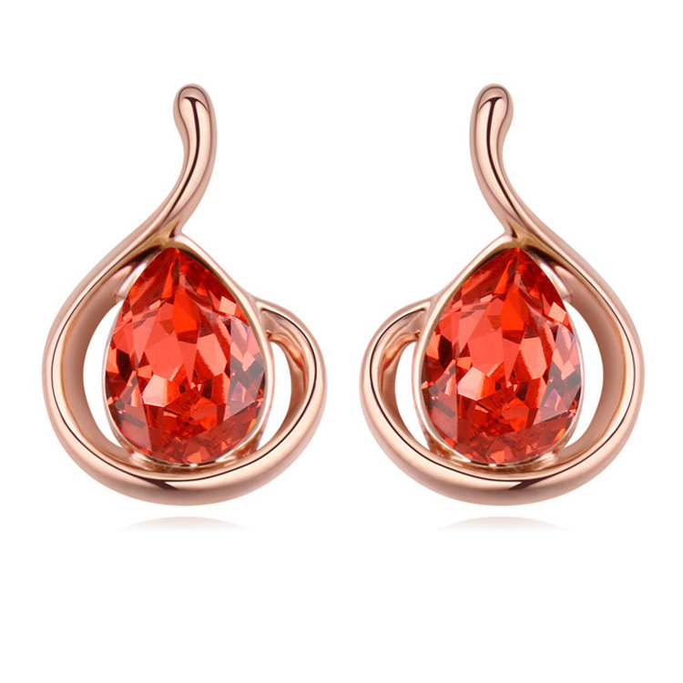 Hermosos aretes, en baño de oro rosa de 18 quilates, diseño de gota, con cristal rojo escarlata corte pera. Fabricado en una estructura de aleación de platino con rodio sin níquel