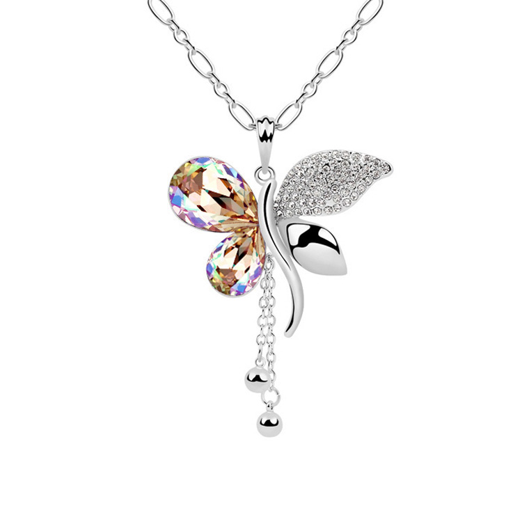 Collar en baño de oro blanco de 18 quilates, diseño de mariposa cristales tornasol corte pera e incrustaciones de cristales blancos.