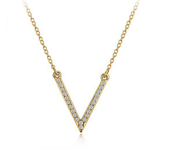 Collar en baño de oro amarillo de 18 quilates, diseño en forma de v con incrustación de cristales en color blanco.