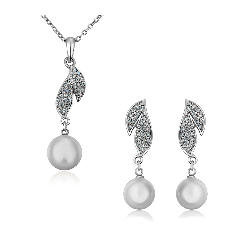 Elegante set de aretes y dije con cadena en baño de oro blanco de 18 quilates, diseño de hoja con detalle de perla blanca con incrustación de cristales en color blanco.