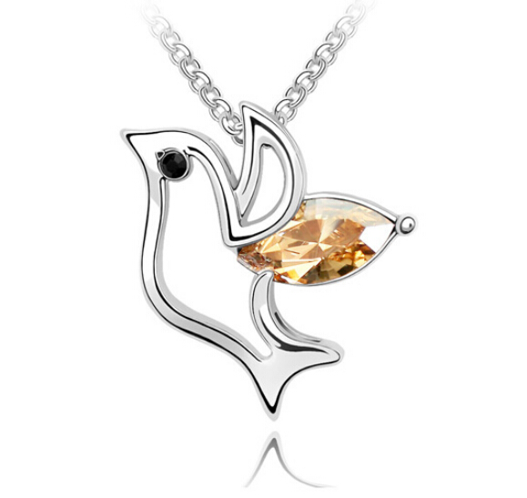 Dije con cadena en baño de oro banco de 18 quilates, diseño de ave con incrustación de cristales en color ámbar y negro. Fabricado en una estructura de aleación de platino con rodio sin níquel 1. joyería Hipoalergénica. 2. Incluye cajita de joyería. 3. Garantía de 30 días por defectos de fabrica.