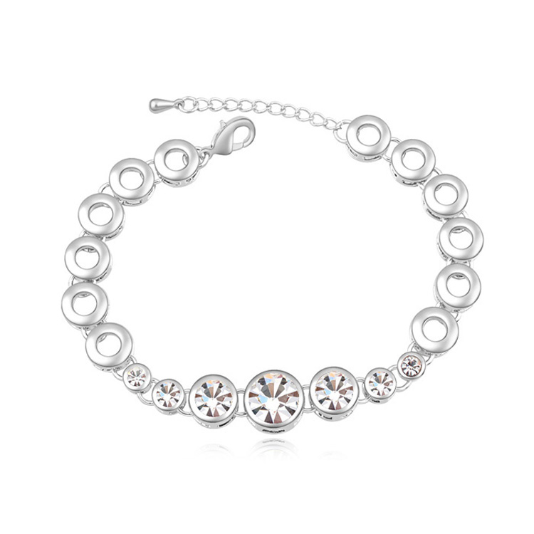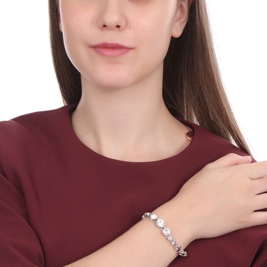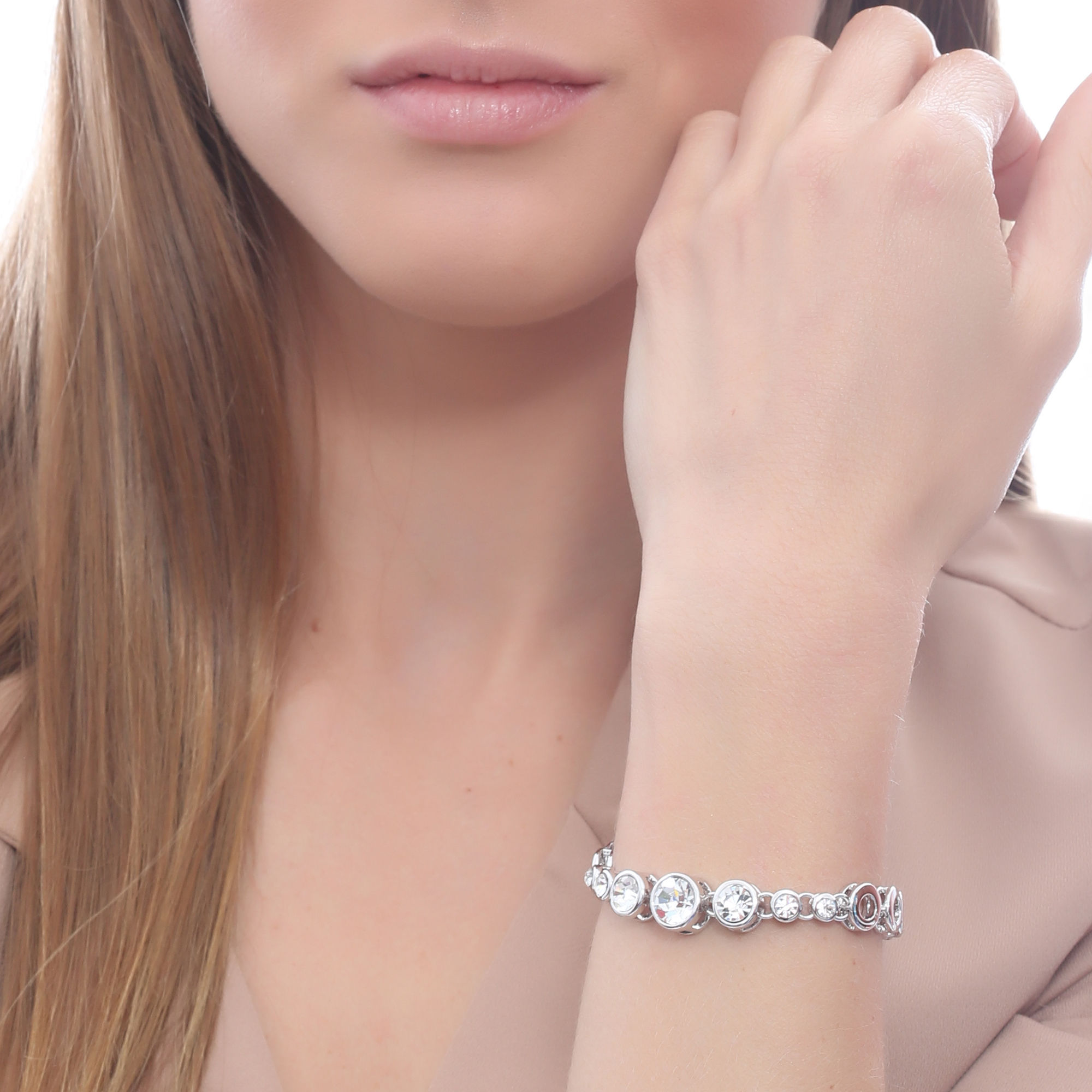Pulsera en baño de oro blanco de 18 quilates, diseño de círculos, con incrustaciones de cristales en color blanco corte brillante.