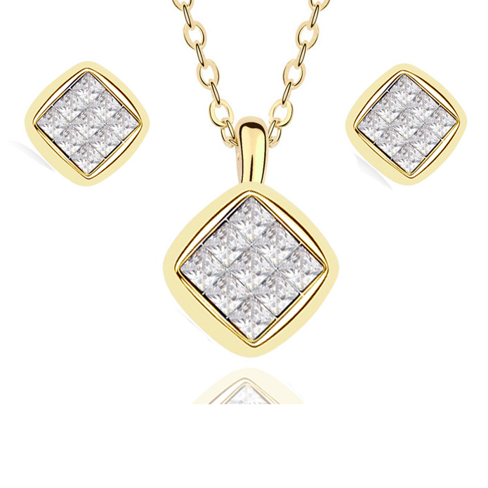 Juego de aretes y dije en acero inoxidable, incrustación de cristales en color blanco.