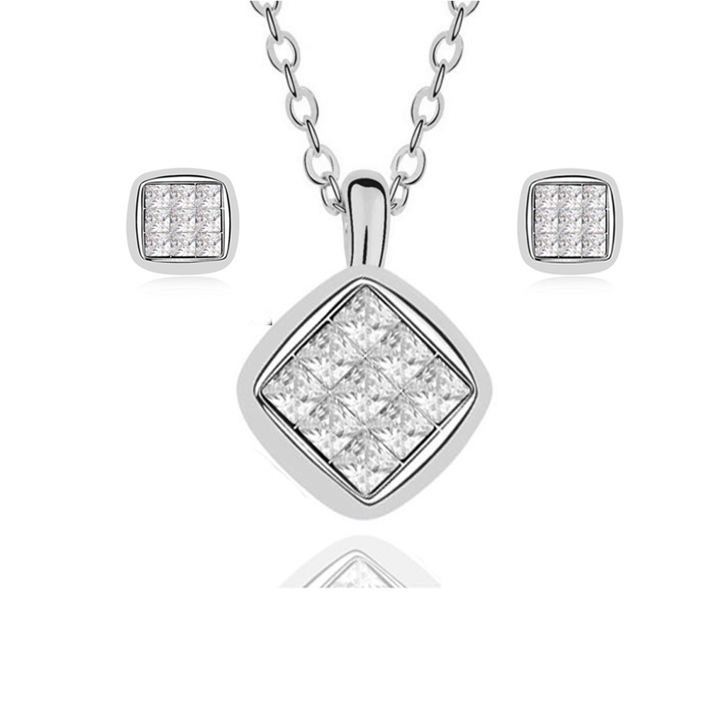 Juego de aretes y dije en acero inoxidable, diseño geométrico con incrustaciones de cristales blancos corte brillante.