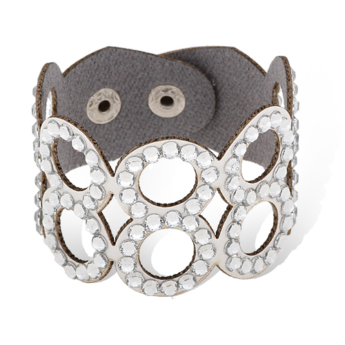 Brazalete en forro de piel con fondo blanco, diseño de círculo calados e incrustaciones de cristales en color blanco.