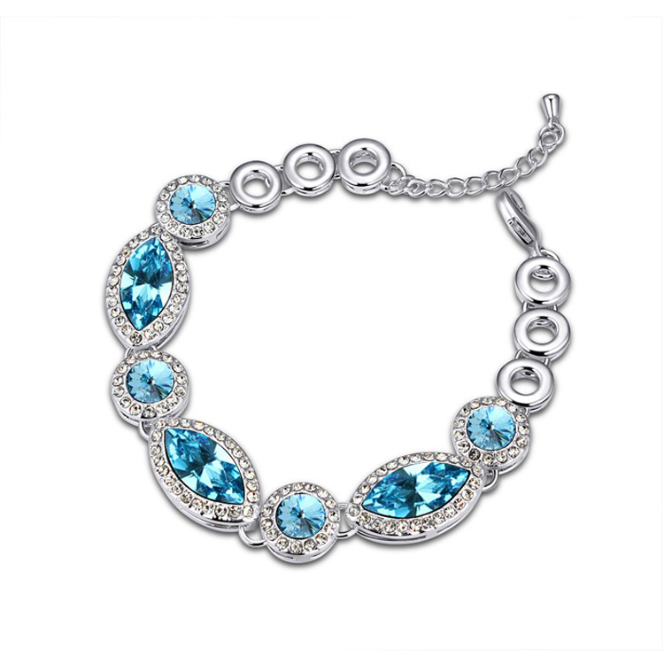 Brazalete en baño de oro blanco de 18 quilates, elegante diseño, con cristales en tonos azules corte marquesa y corte brillante e incrustaciones de cristales blancos.