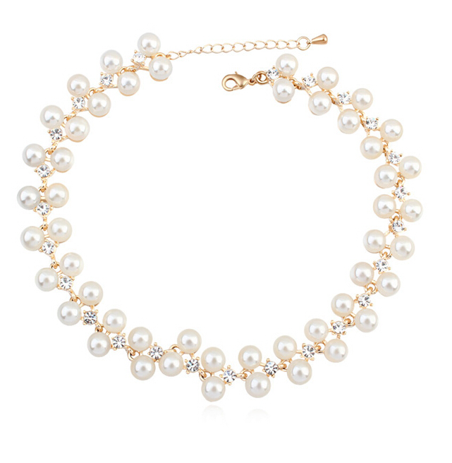 Hermoso Collar en baño de oro amarillo de 18 quilates, fino diseño con detalles de perlas en color beige e incrustación de cristales en color blanco. Fabricado en una estructura de aleación de platino con rodio sin níquel 1. joyería Hipoalergénica. 2. Incluye cajita de joyería. 3. Garantía de 30 días por defectos de fabrica.