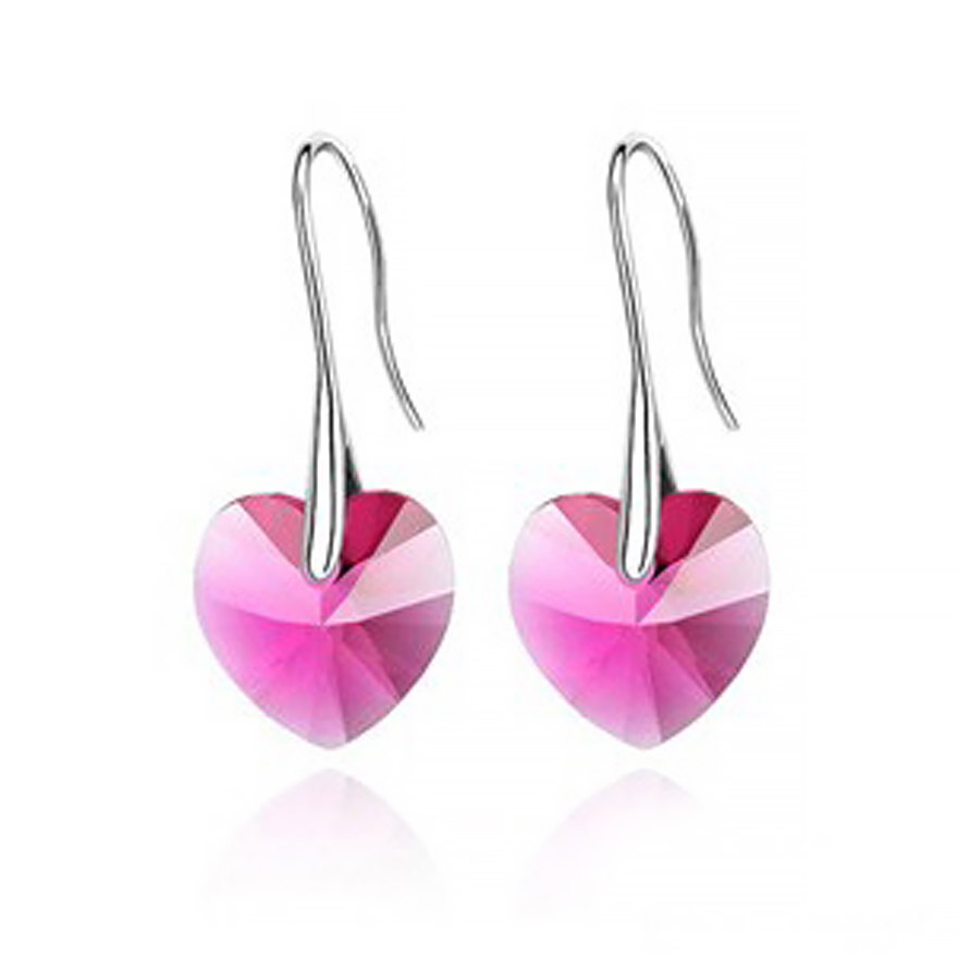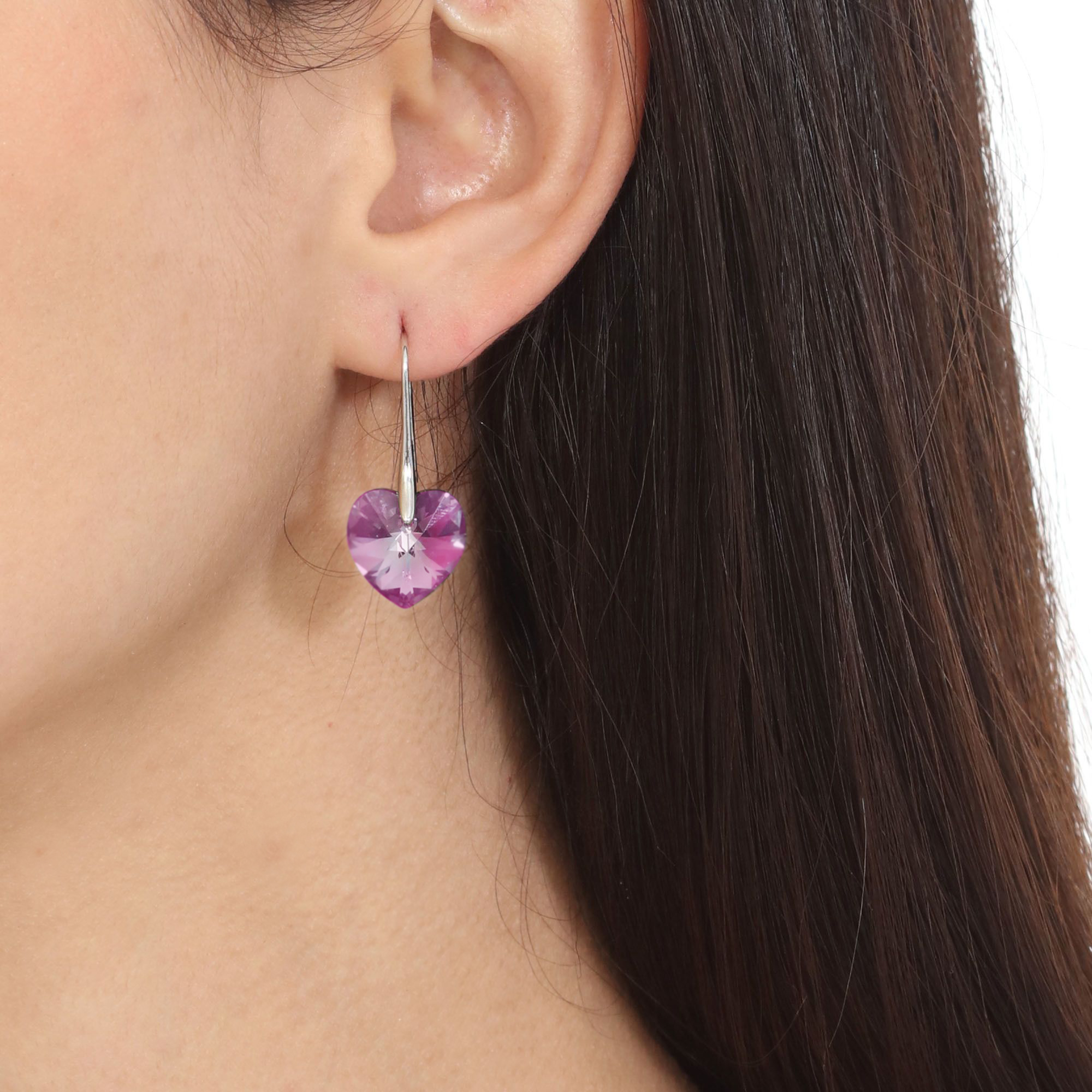 Hermosos aretes, en baño de oro blanco de 18 quilates, diseño de corazón, en cristal color rosa. Fabricado en una estructura de aleación de platino con rodio sin níquel.