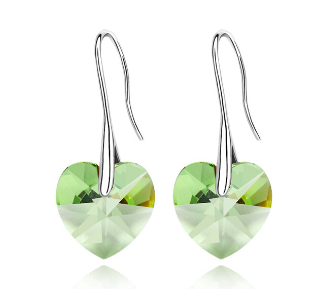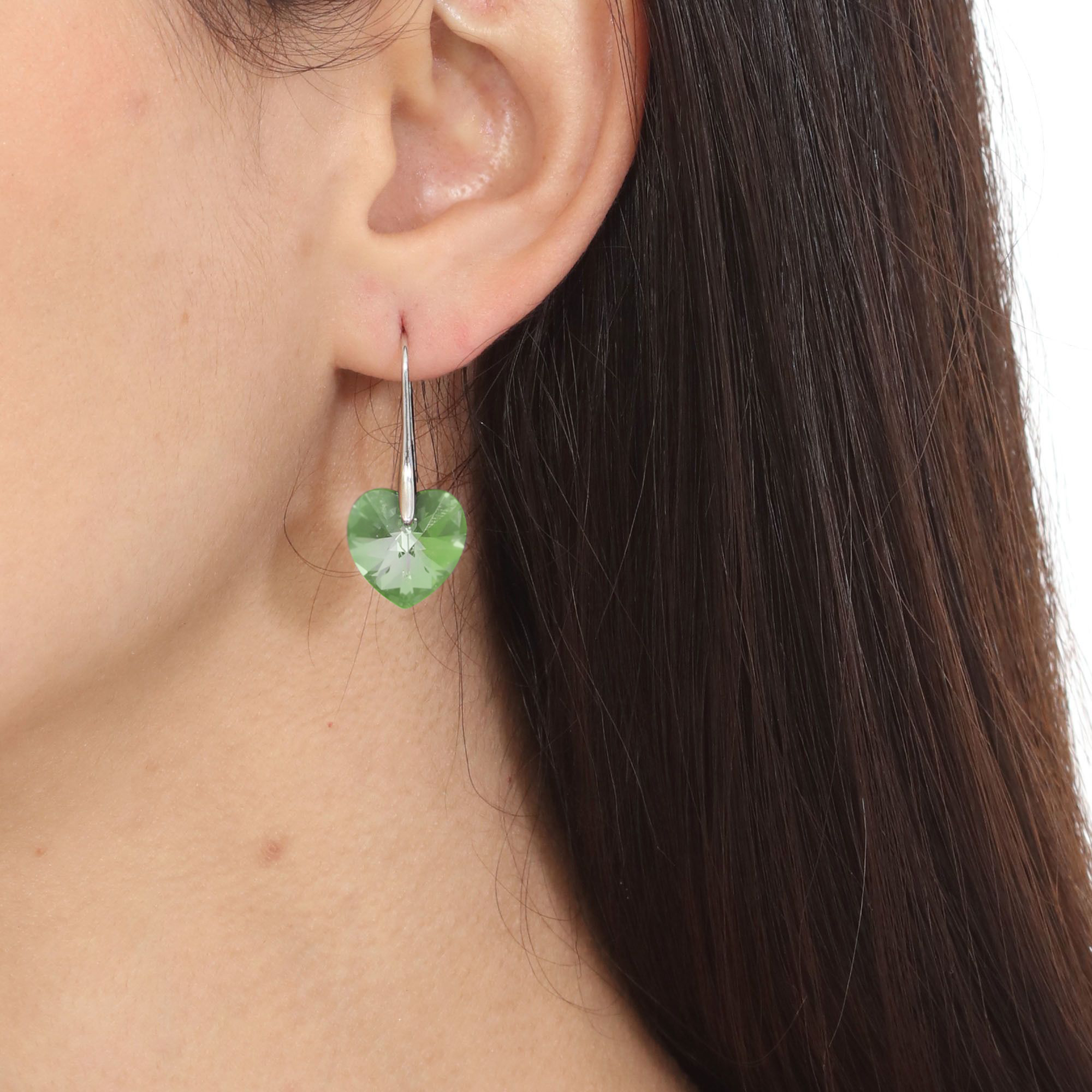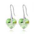 Hermosos aretes, en baño de oro blanco de 18 quilates, diseño de corazón, en cristal color verde lima. Fabricado en una estructura de aleación de platino con rodio sin níquel.