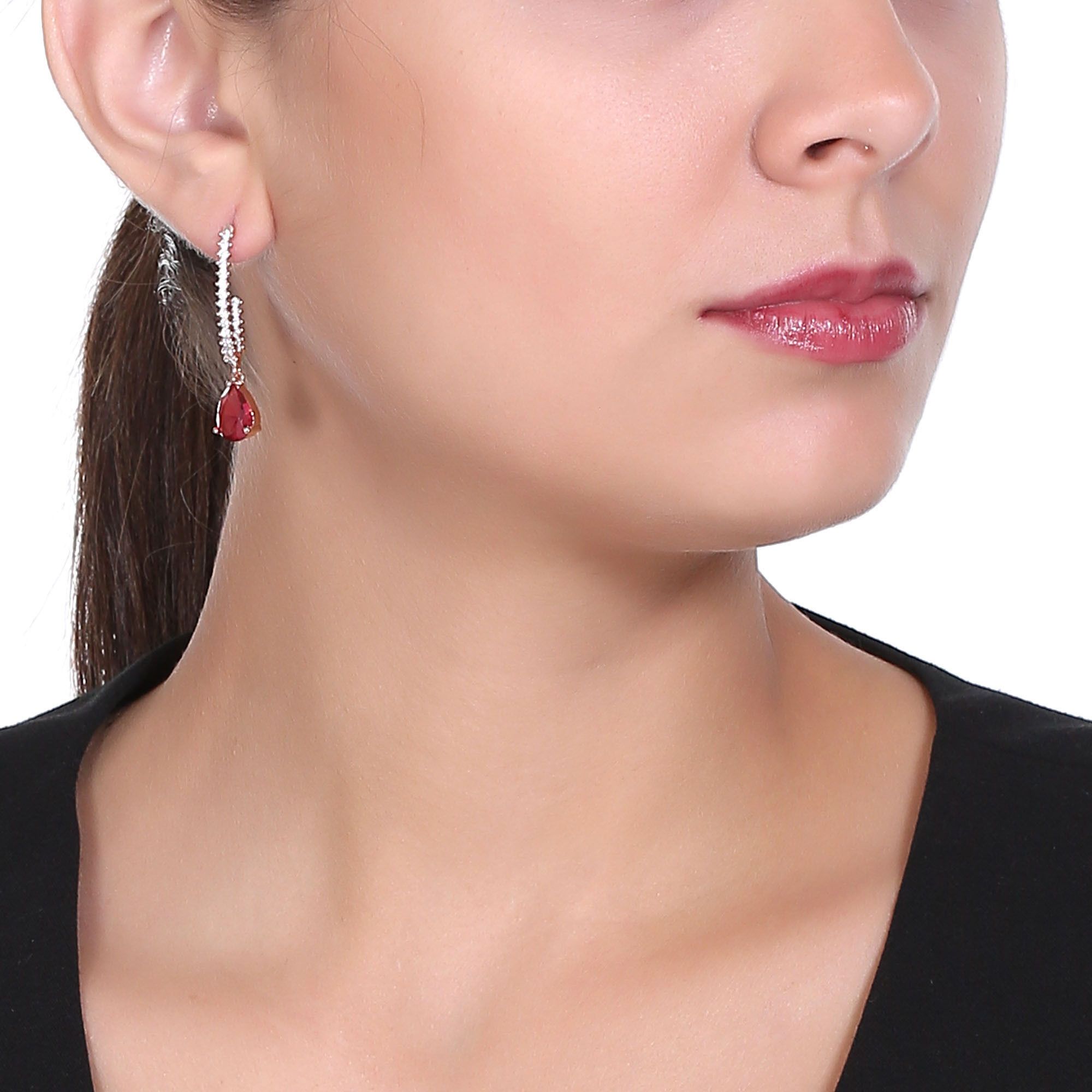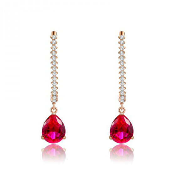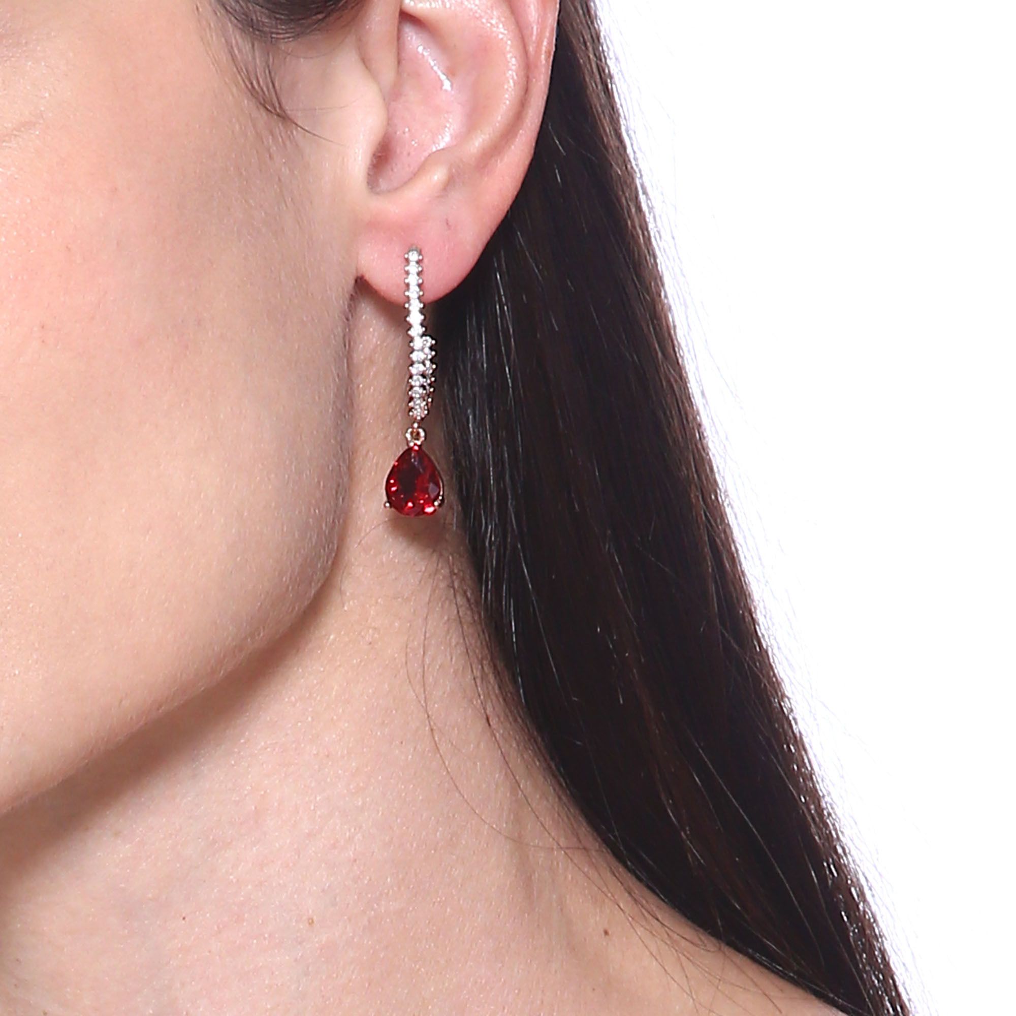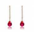 Elegantes aretes en baño de oro rosa de 18 quilates, diseño de gota, con cristal color carmín corte pera e incrustaciones de cristales blancos. Fabricado en una estructura de aleación de platino con rodio sin níquel.