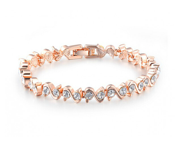 Lindo brazalete, en baño de oro rosa de 18 quilates, fino diseño de grecas engarzadas, con incrustaciones de cristales blancos en corte brillante.